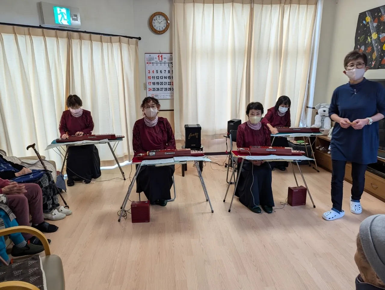 今日は、職員の知り合いが大正琴の先生をしているとのことで、施設に来てもらいました。グループホームとファミリーケアと一緒に鑑賞するのは、三年ぶりくらいです。前の日から、職員や利用者の方も楽しみにしていました。演奏は、皆さんが知っている曲ばかりで、手拍子や口ずさむ方がほとんどでした。いつも、落ち着かいない利用者の方も、その時だけは立ち上がりもなく真剣にきいていました。普段、意思の疎通が難しい方も、涙を流し喜んでくれました。最後のお礼の言葉を、グループホームとファミリーケアから利用者の方いわれました。大正琴の方が帰ってからも「今日は楽しかった」と言ってくれました。認知症の方は、楽しい思い出は忘れてしまうと言いますが、残っている方もいると思うとやって良かったと思いました。