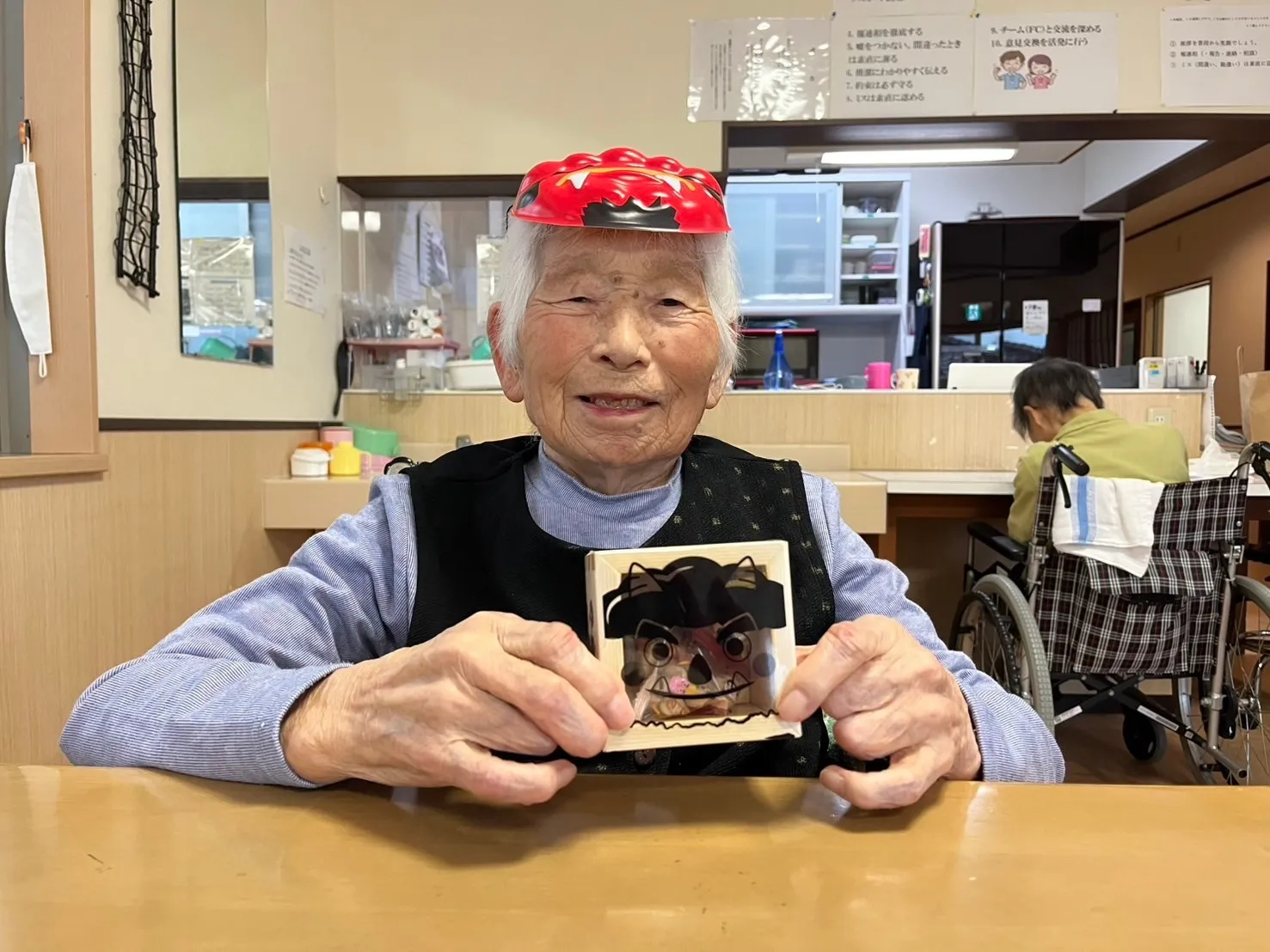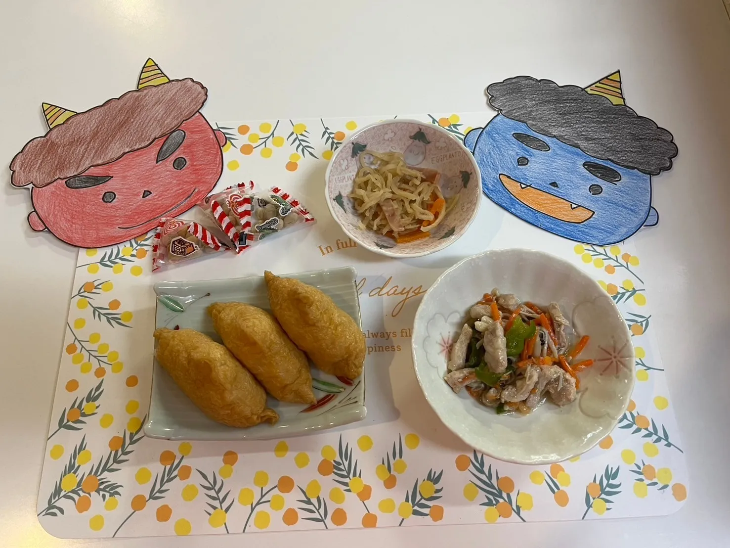 鬼のお面をつけ写真撮影も行いました。昼食は職員手作り、恵方巻ではなくいなり寿司でした。「美味しい」と喜ばれました。